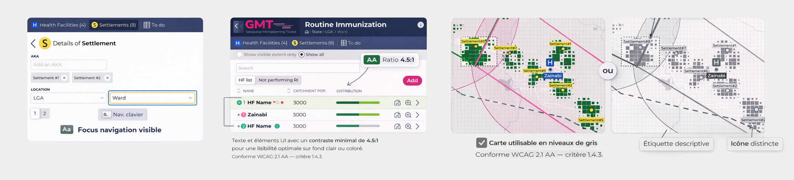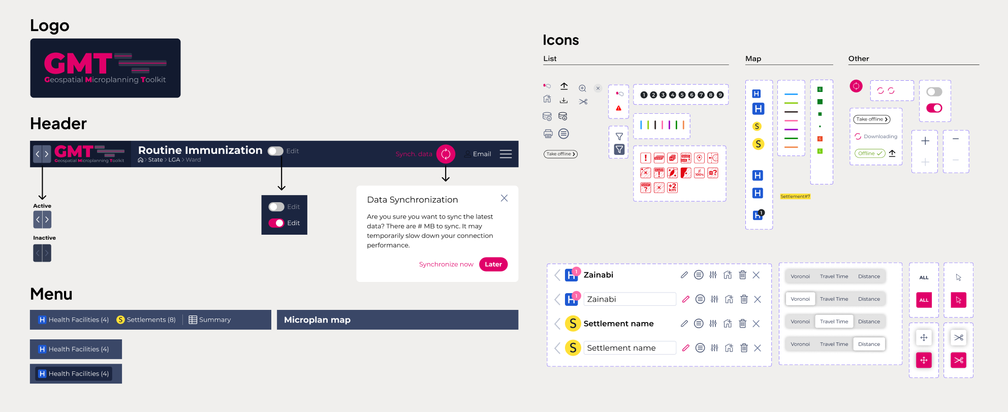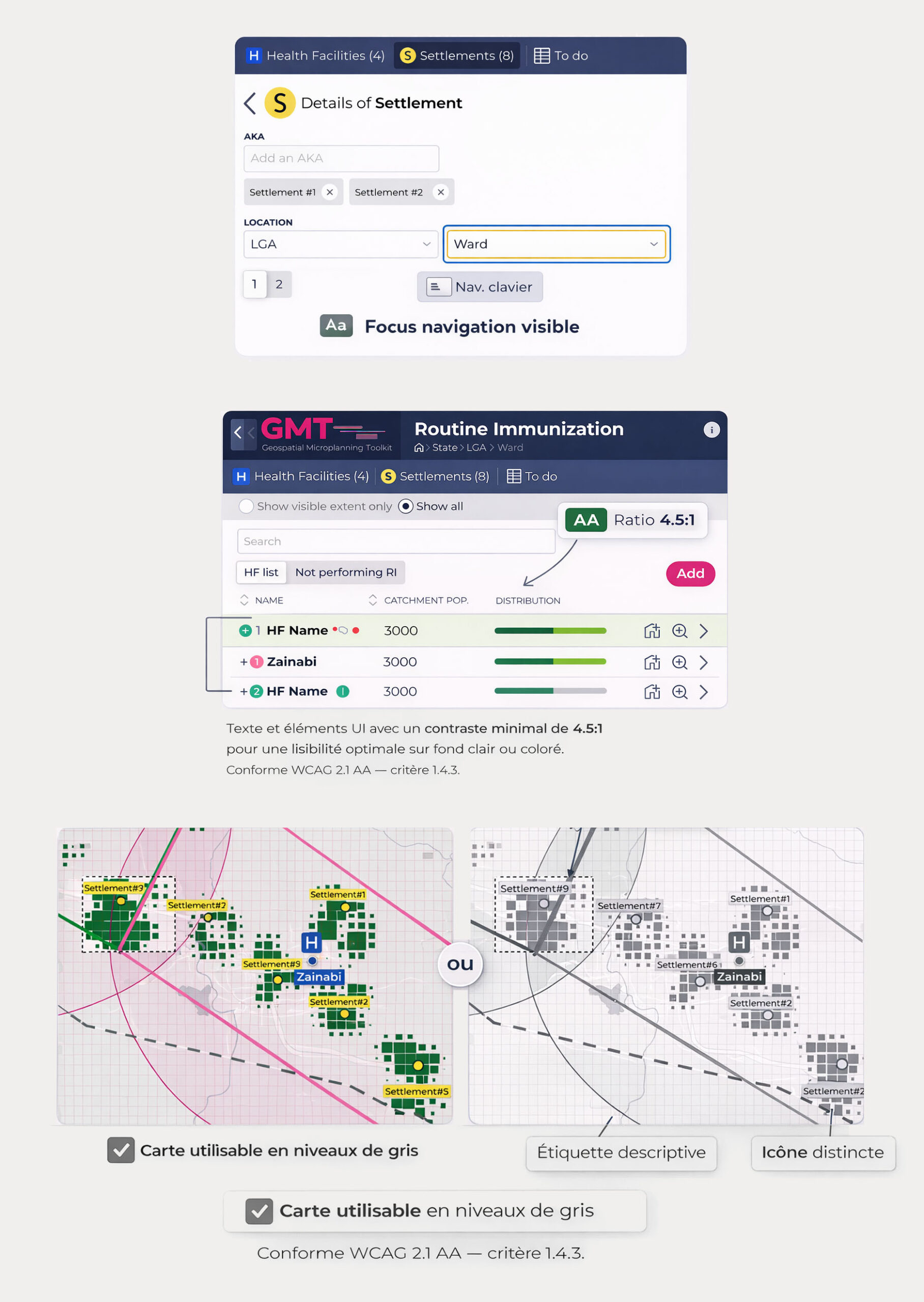 L’une des finalités du projet était de pouvoir fournir aux équipes des microplans détaillés, clairs et contextuels des déroulés des opérations dans les zones géographiques choisies. J’ai gardé une base neutre, très lisible, tiré des règles WCAG des écrans, car l’utilisation sur le terrain se fait souvent dans des conditions aléatoires.